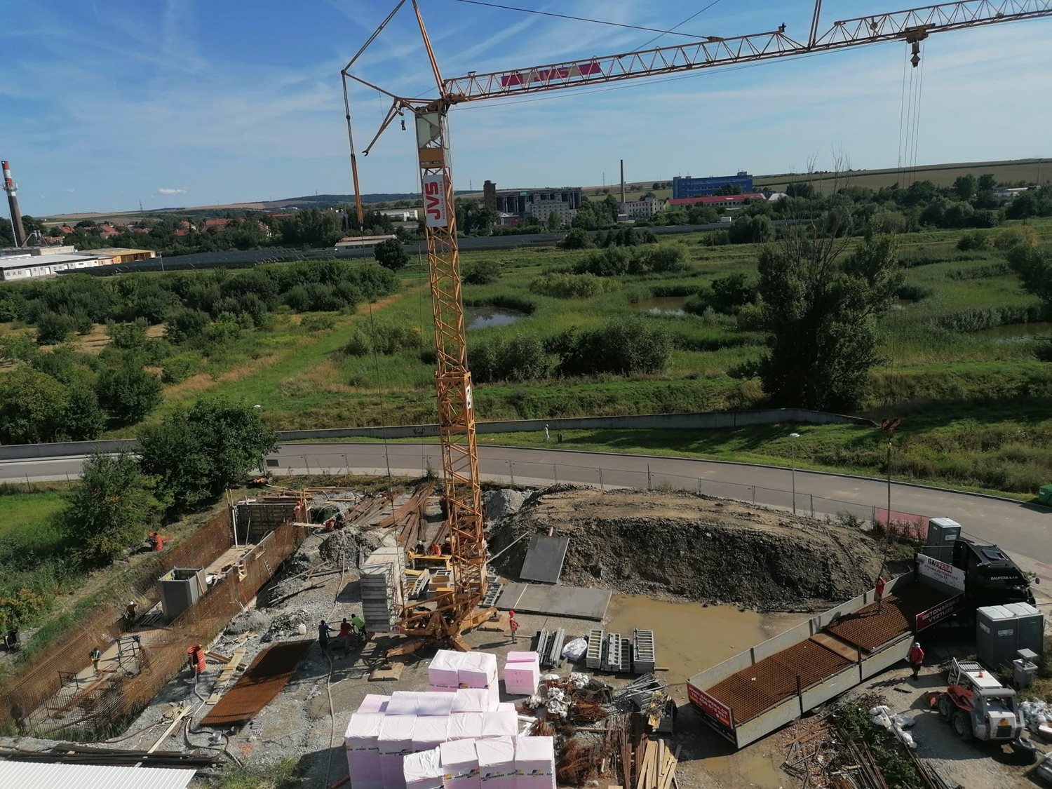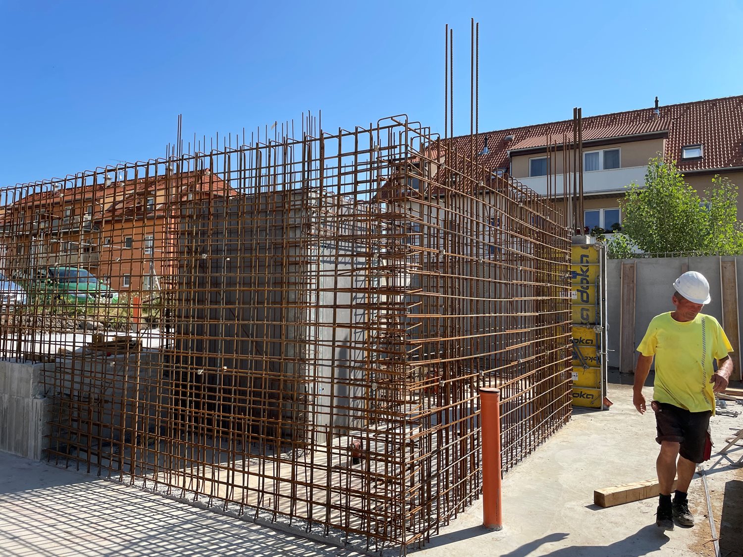 10.08.2021 F - pohled na bytovku z jeřábu; probíhá vázání výztuže svislých konstrukcí