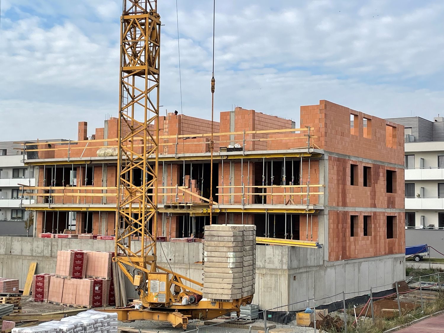 10.08.2021 C2 - pohled na bytovku z jeřábu; probíhá bednění stropu garáže