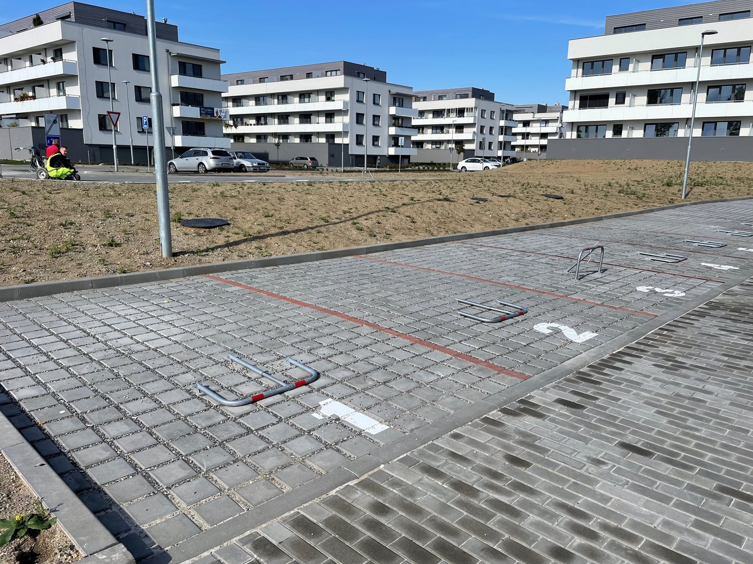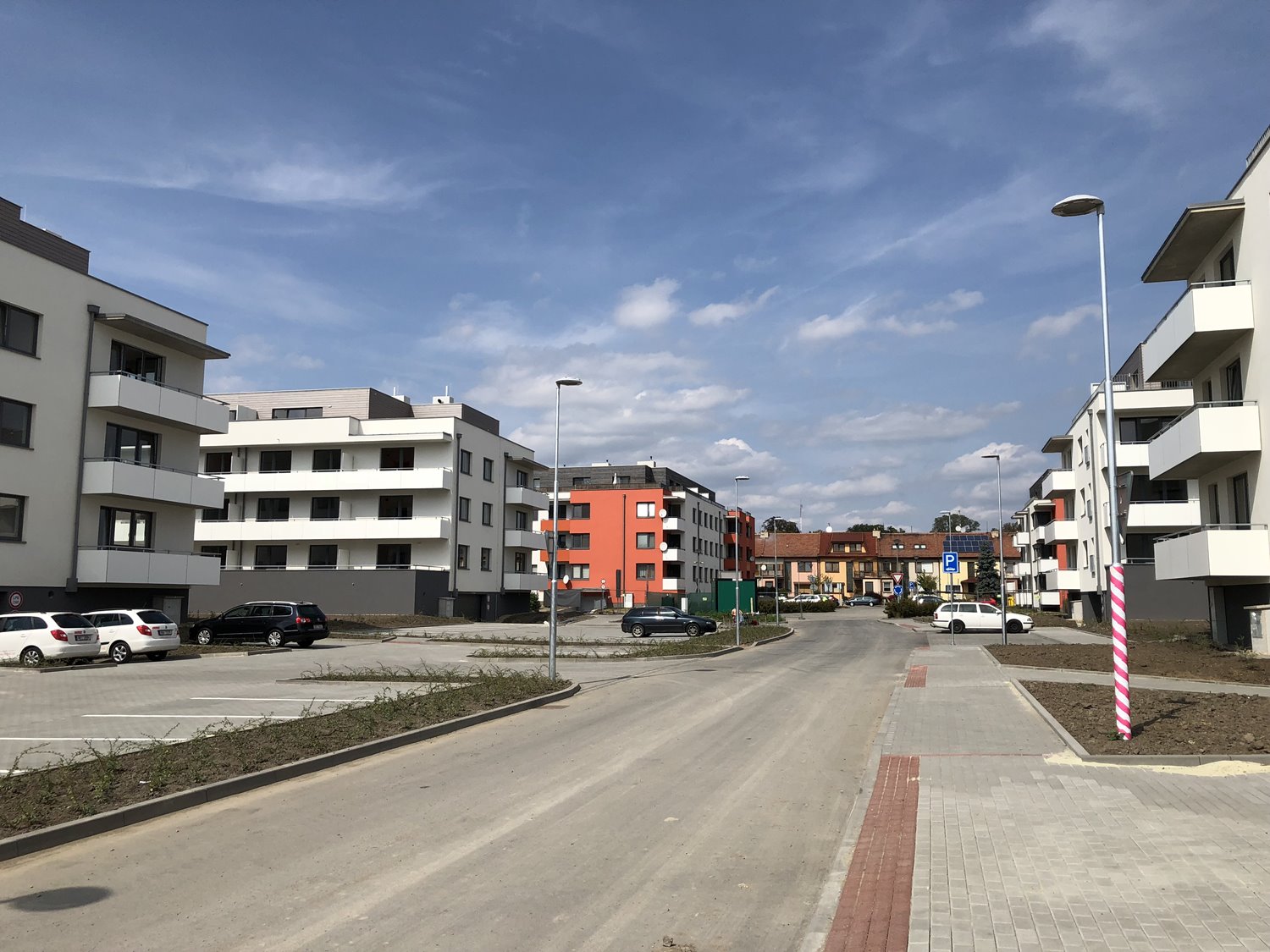 1.8.2018 - BD - páteřní komunikace mezi bytovými domy; s výhledem na venkovní parkovací stání u A2 a E1