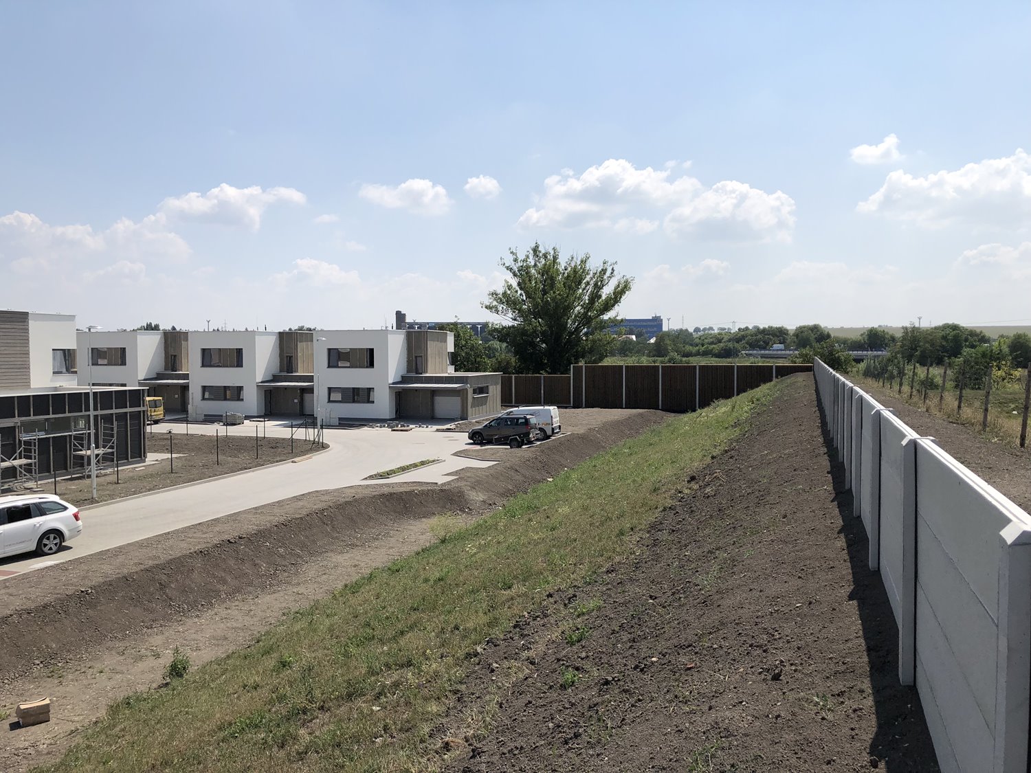 RD -páteřní komunikaci u rodinných domů; pohled z protihlukové zdi na valu